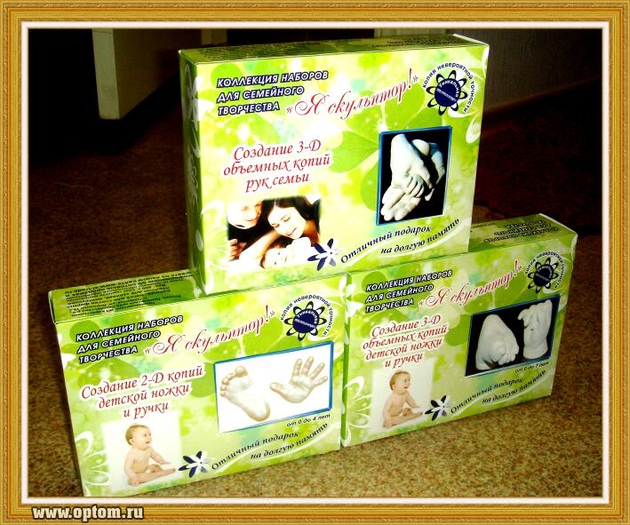 Краткий перечень производимой продукции коллекция уникальных наборов для семейного творчества "Я СКУЛЬПТОР!!!". создание копий и объемных копий ручек и ножек детей, а так же рук всей семьи. низкая цена и высокое качество, эффектная упаковка